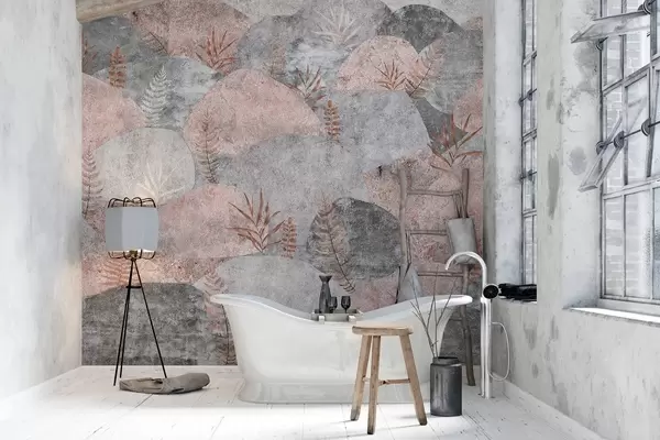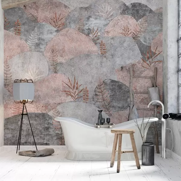 Тапете за зид Камење са биљкама, папрат, нордијски, рустични стил, сиве и ружичасте боје бр. w04064v1