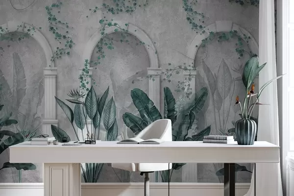 Тапете за зид Бетонски зид са луковима и тропским биљкама, цветним, плавим бојама бр. w04065v2