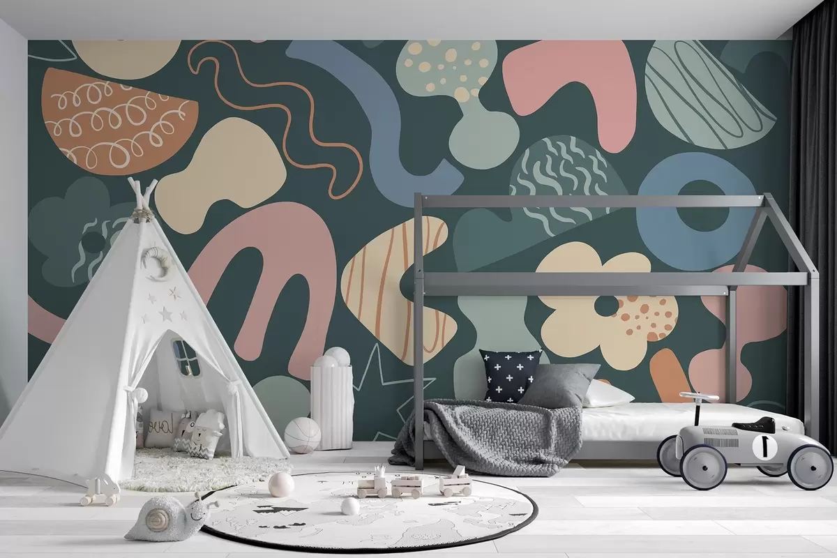 Тапете за зид Геометријске фигуре са цртежима, малолетничке, тамнозелена позадина бр. w04068v3