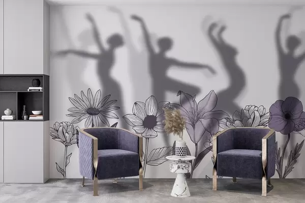 Тапете за зид Силуете балерина, рустично цвеће, линијске цртеже, сиве и љубичасте боје бр. w04069v2