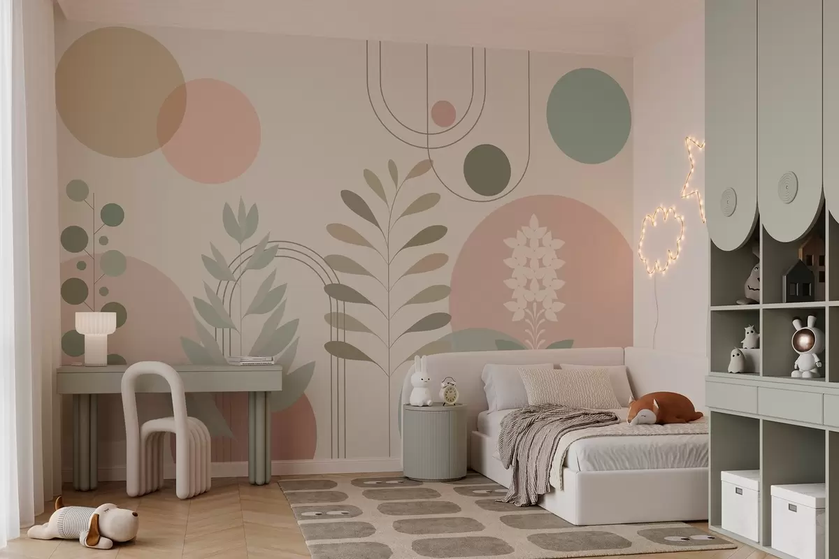Тапете за зид геометријска апстракција са круговима и стилизованим биљкама на кремастој позадини бр. w04070