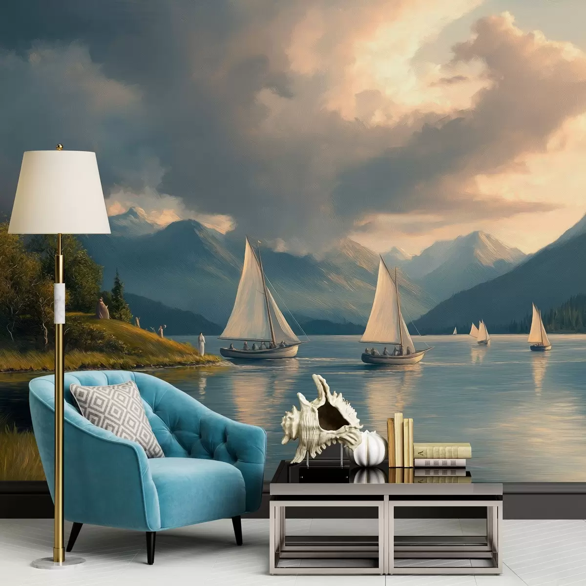 Тапете за зид Регата на језеру са облачним небом у стилу уљане слике из 19. века бр. w04076