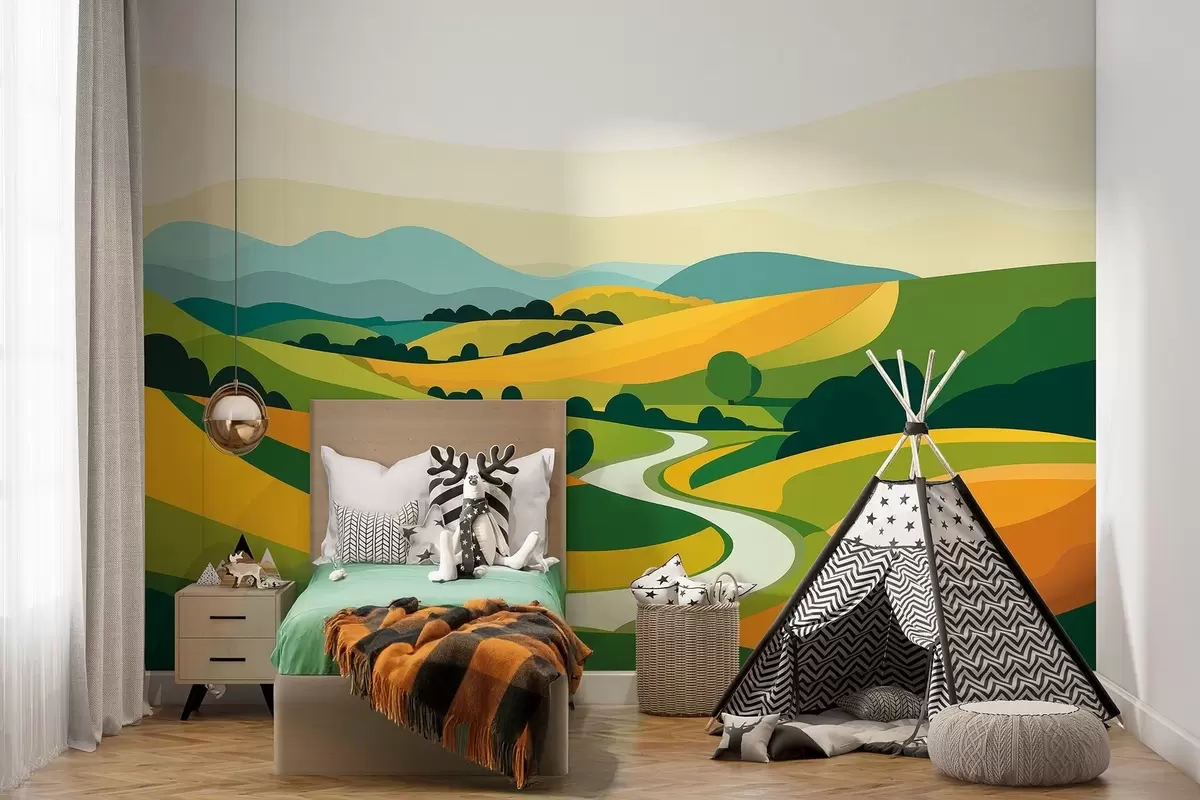 Тапете за зид Апстрактни пејзаж са брдима и дрвећем, живописне боје бр. w04116