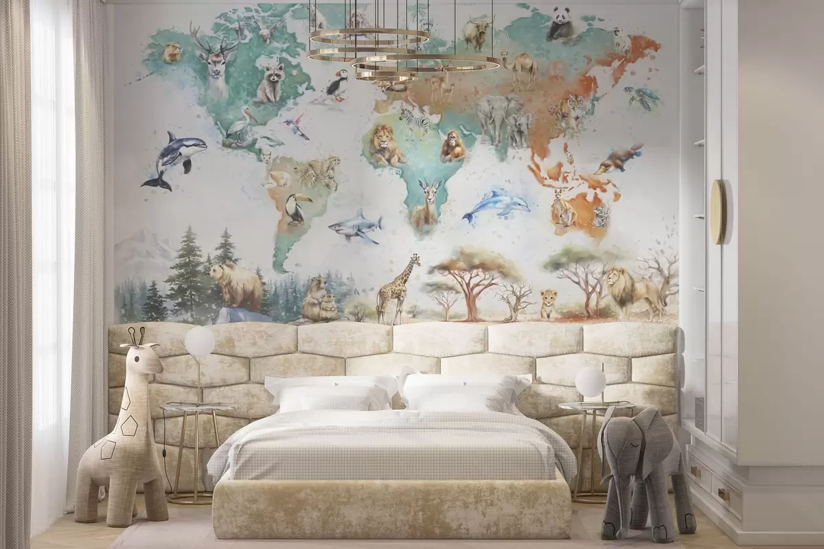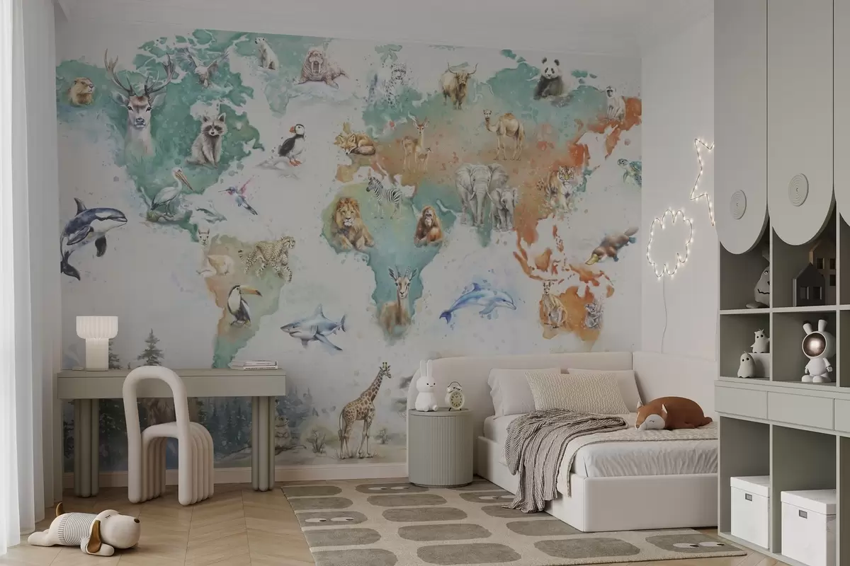 Тапете за зид Мапа света са животињама, стил дечје едукативне илустрације бр. w04148