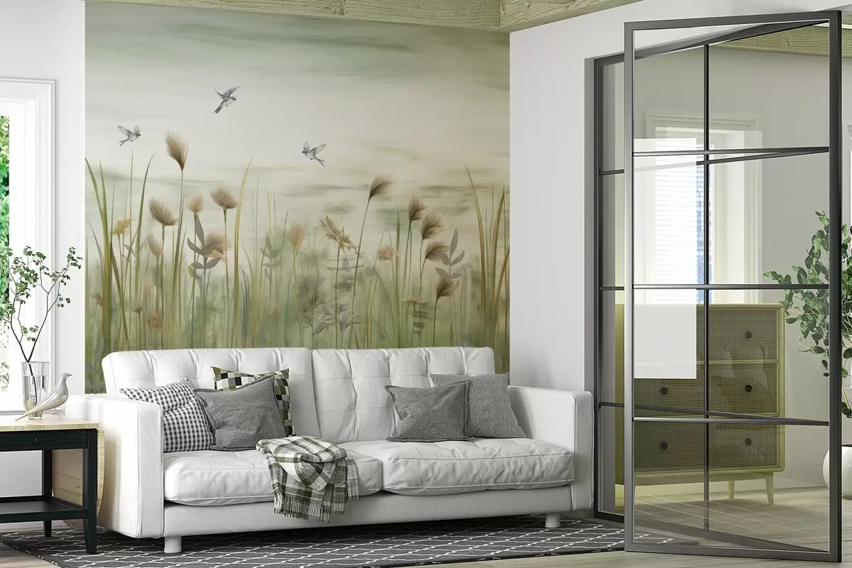 Тапете за зид Травнати пејзаж са ластама уз меко небо бр. w04258v1
