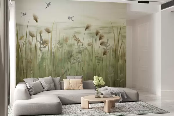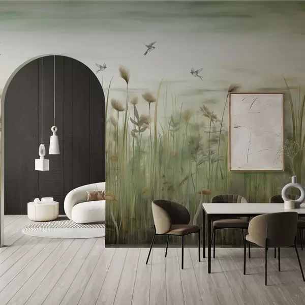 Тапете за зид Травнати пејзаж са ластама уз меко небо бр. w04258v1