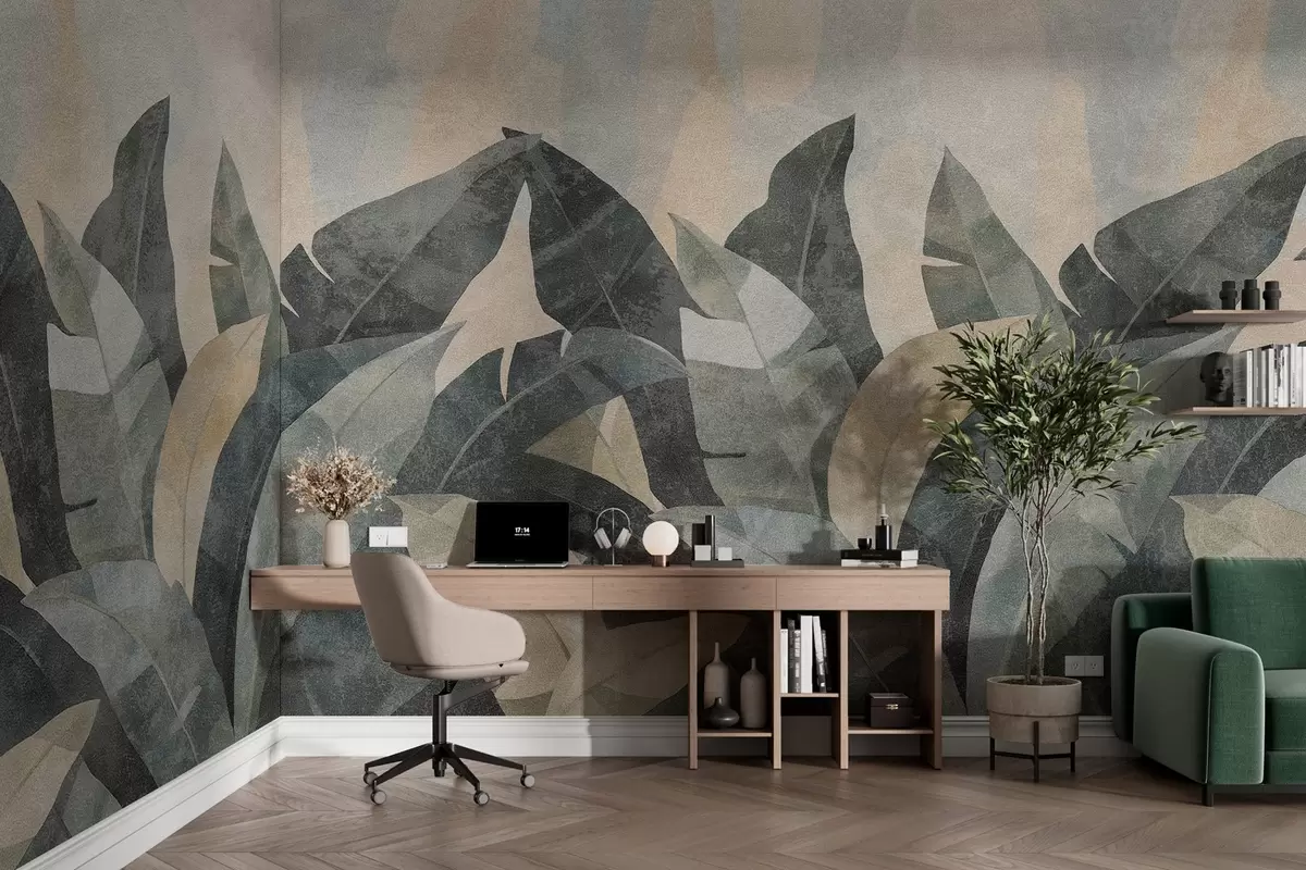 Тапете за зид текстурирани листови банане у природним нијансама беж, зелене и сиве бр. w04285