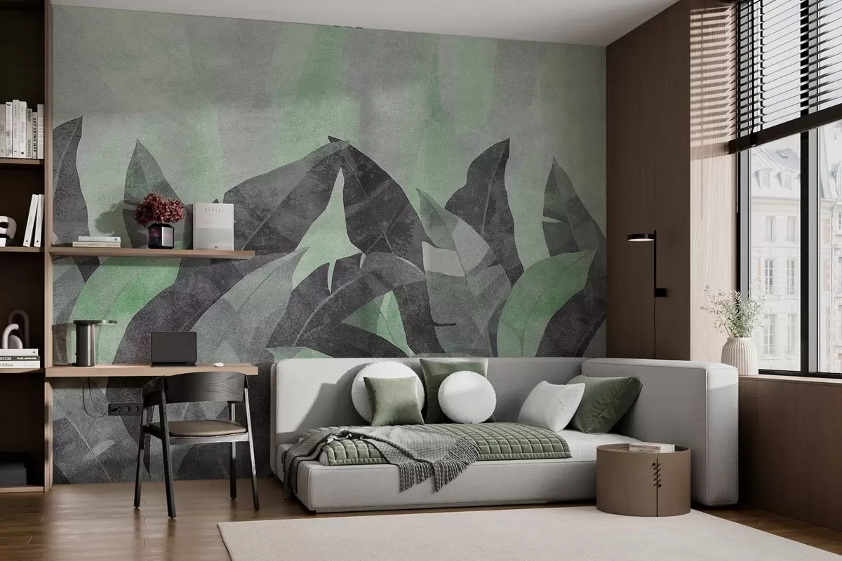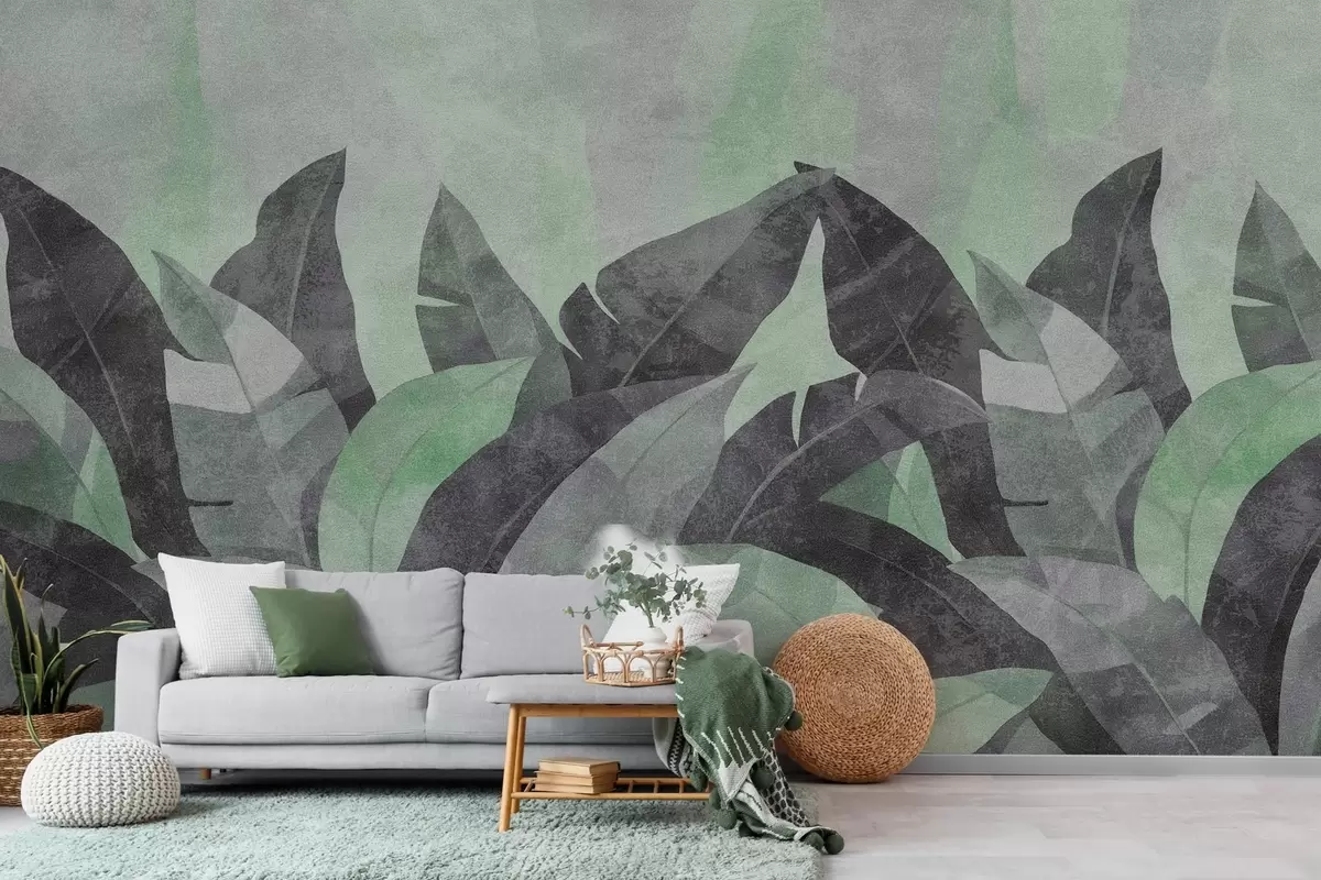 Тапете за зид текстурирани листови банане у нијансама зелене и сиве бр. w04285v1