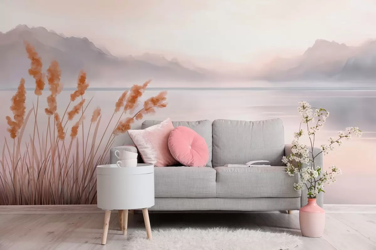 Тапете за зид сликовито језеро са трском и планинама бр. w04315