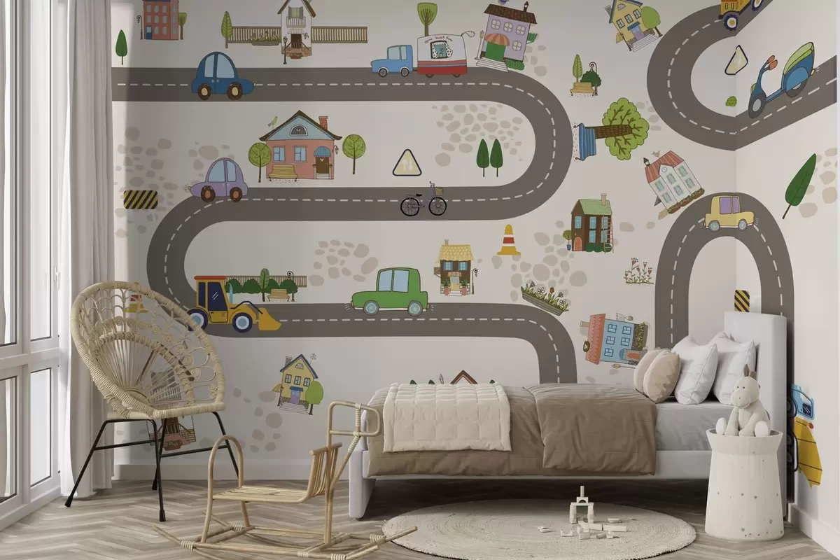 Тапете за зид Дечји пут са аутомобилима и шареним кућама бр. w04404