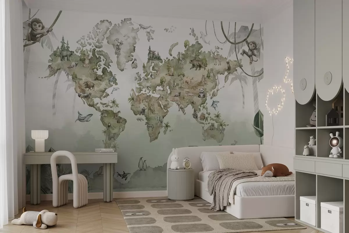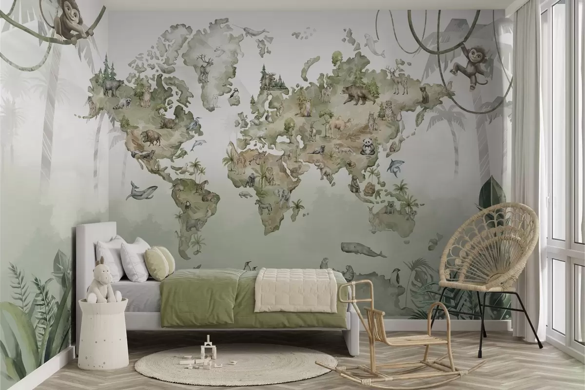 Тапете за зид Илустрована мапа света са животињама и џунглама бр. w04418v1