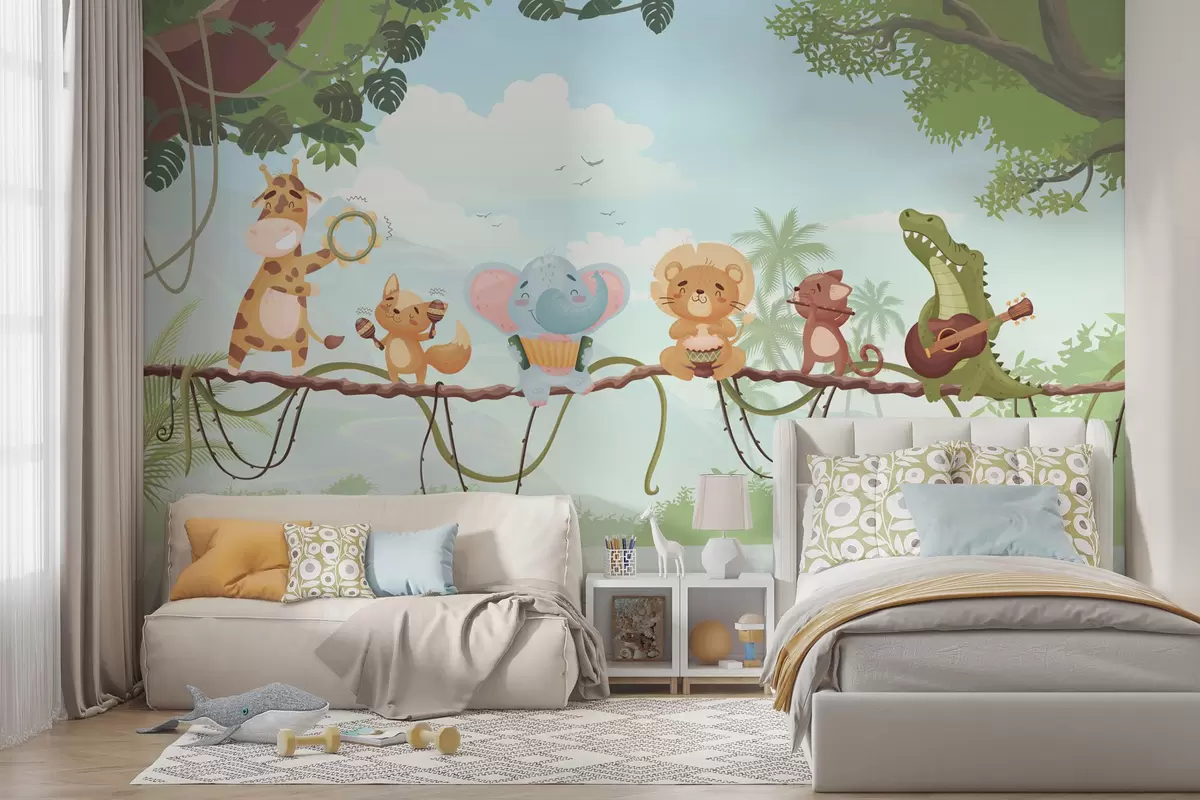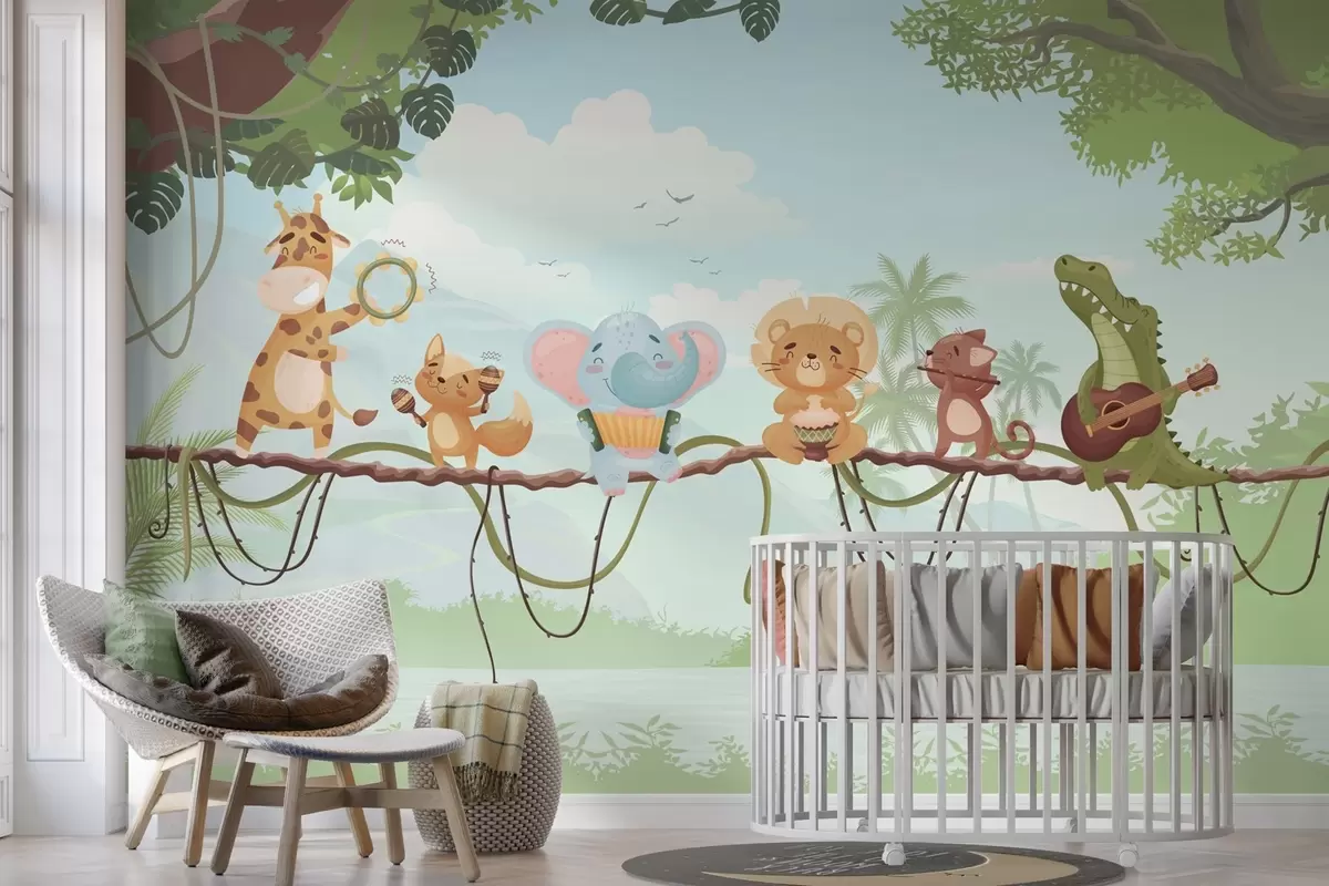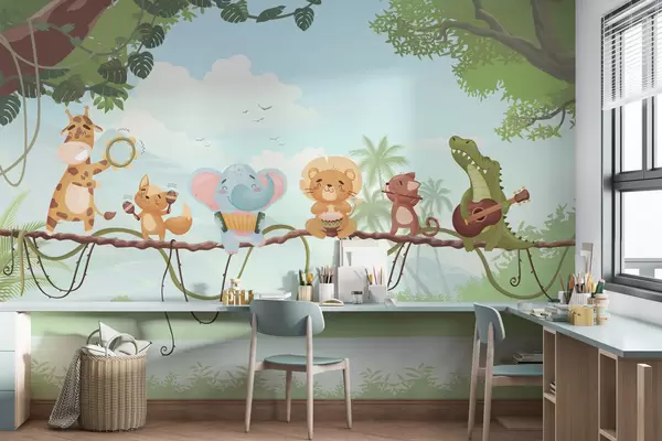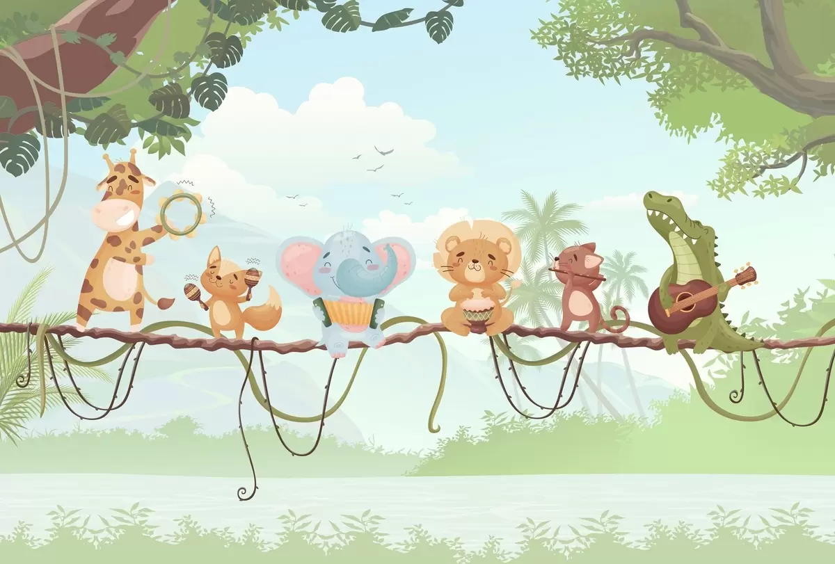 Тапете за зид Животиње са музичким инструментима насупрот тропског пејзажа бр. w04505