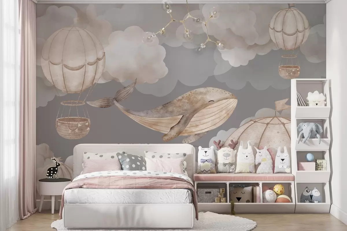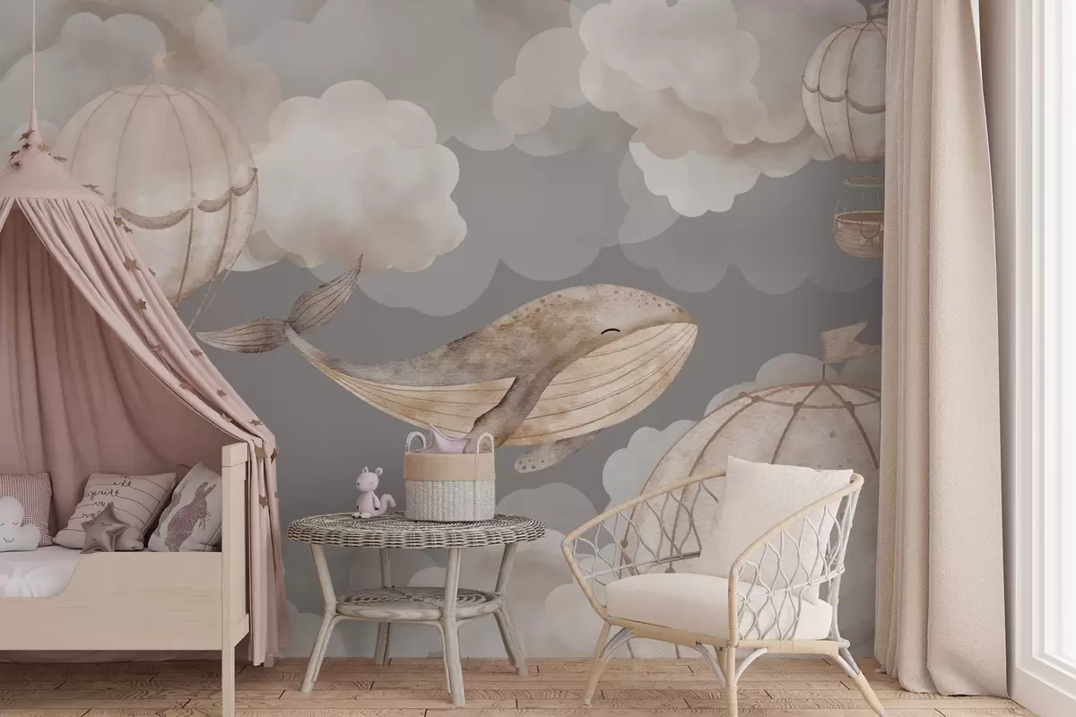 Тапете за зид Кит и балони на врући ваздух међу меким облацима бр. w04522