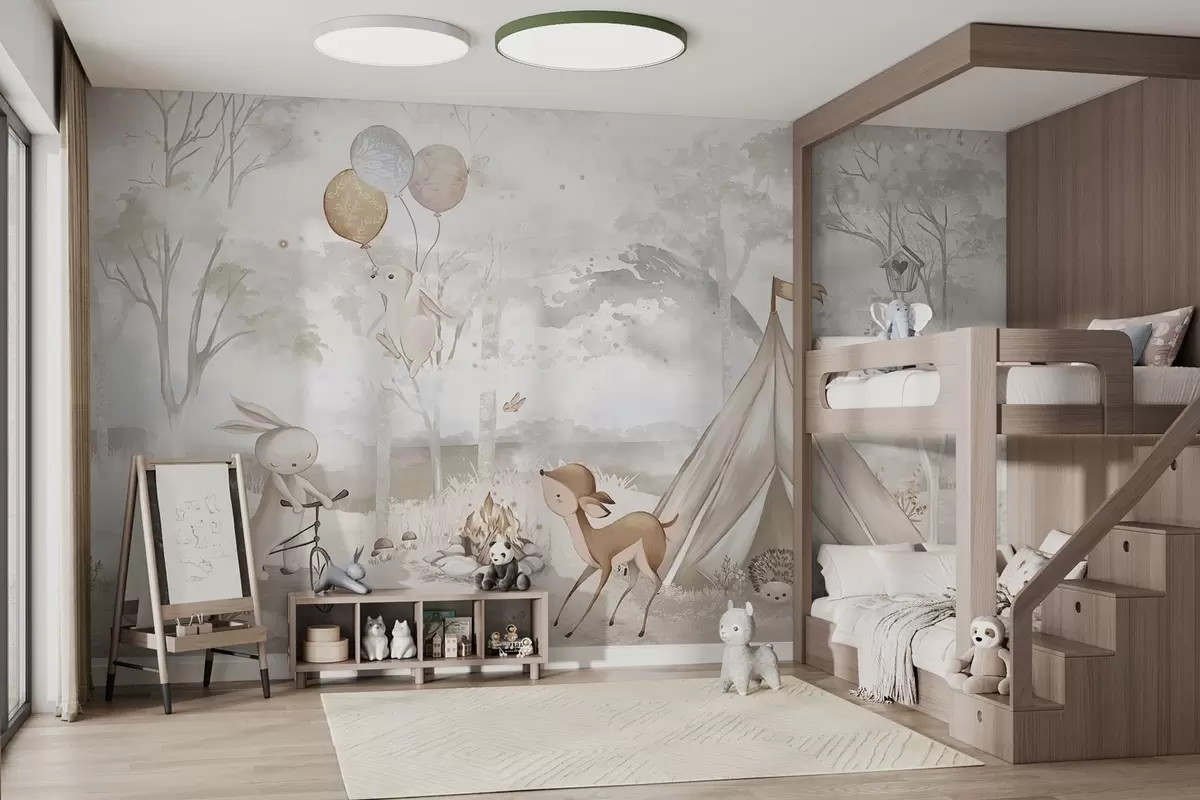 Тапете за зид Дечији камп у топлим беж тоновима, шатор и шумске животиње бр. w04671