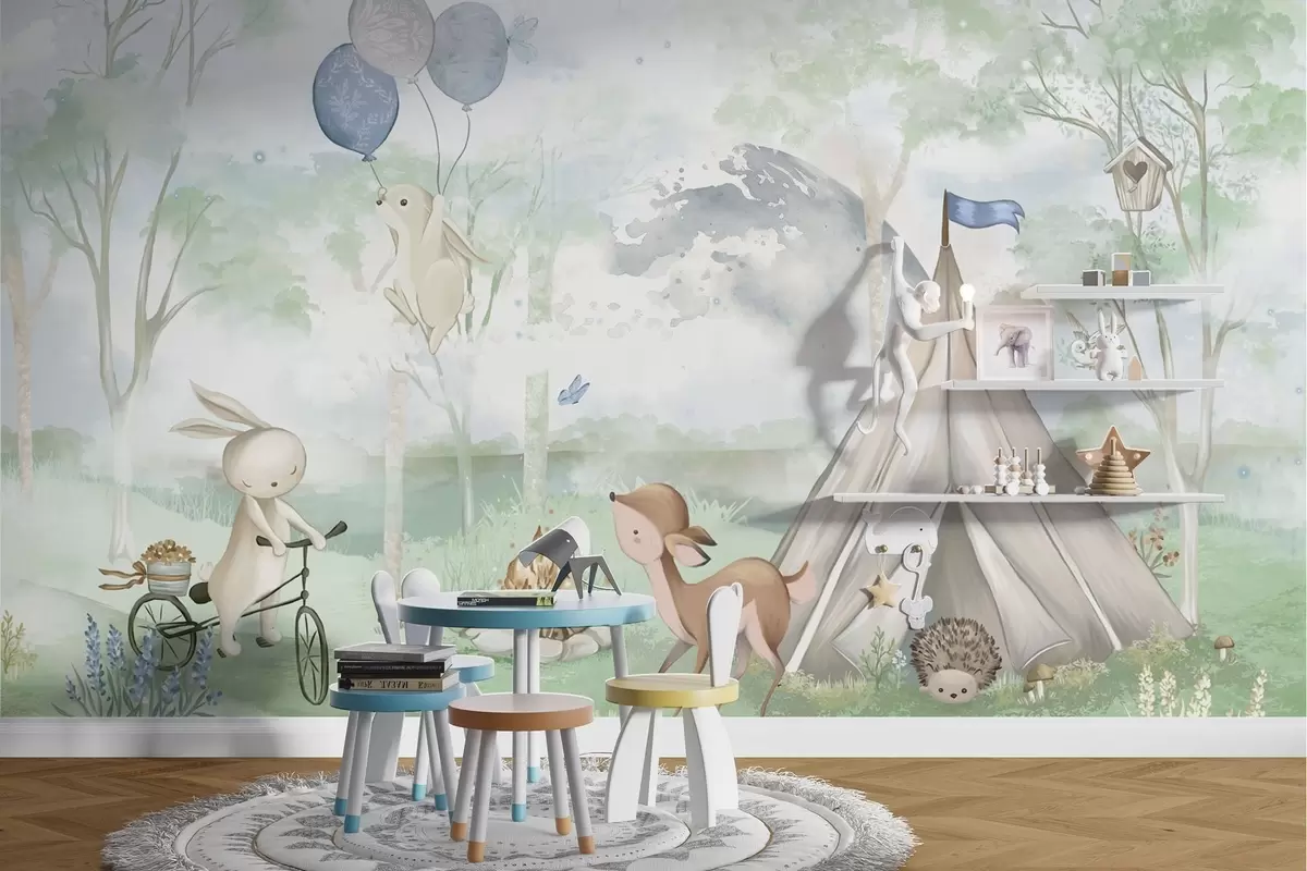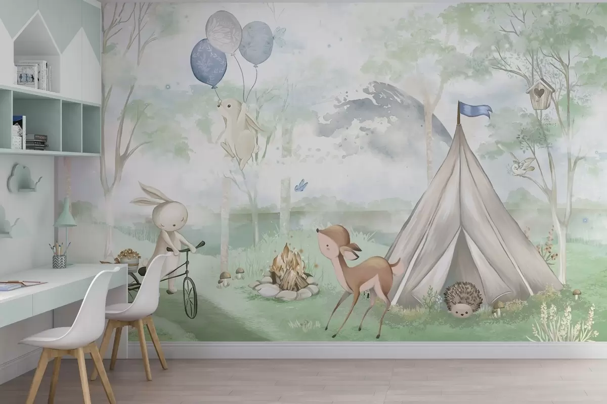 Тапете за зид Дечји шумски камп: зечићи, лане, шатор и логорска ватра бр. w04671v1