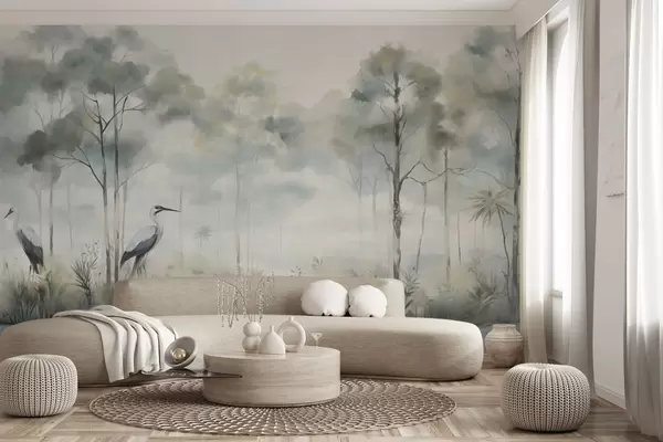 Тапете за зид Магловита шума поред воде са чапљама, мека хладна палета бр. w04788