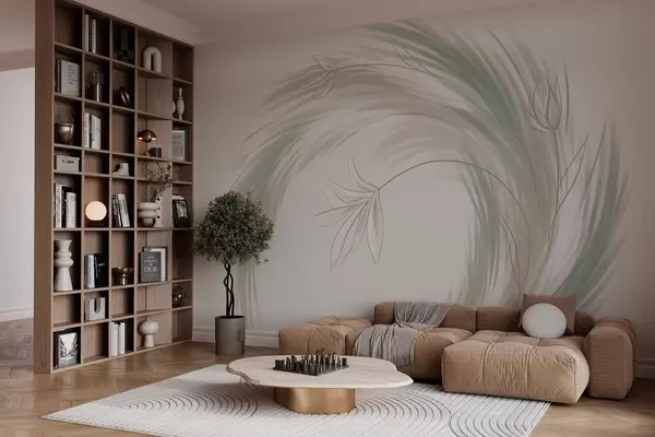 Тапете за зид зелено и беж перје и цвеће, ручно осликано бр. w04816