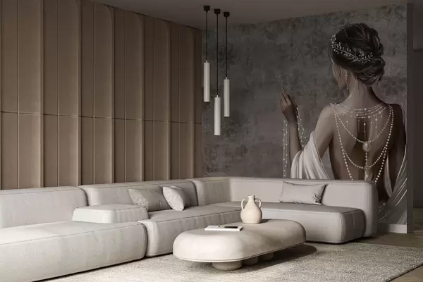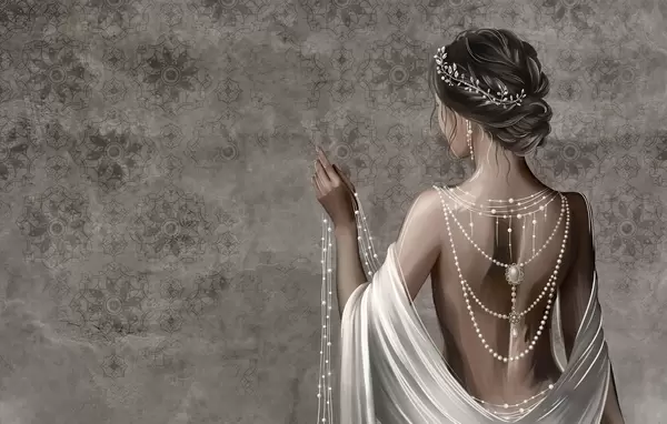 Тапете за зид Жена виђена одострага са бисерима, позадина са сивим узорком камена бр. w04854