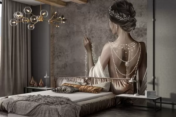 Тапете за зид Жена виђена одострага са бисерима, позадина са сивим узорком камена бр. w04854