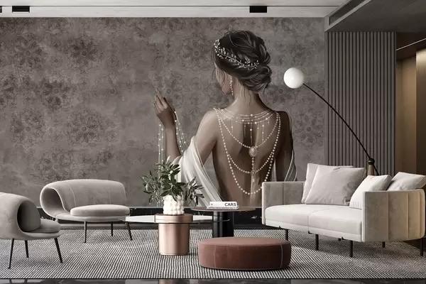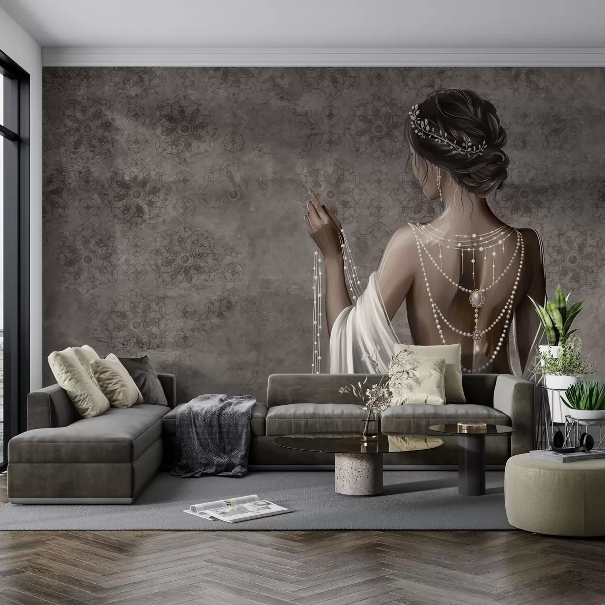 Тапете за зид Жена виђена одострага са бисерима, позадина са сивим узорком камена бр. w04854