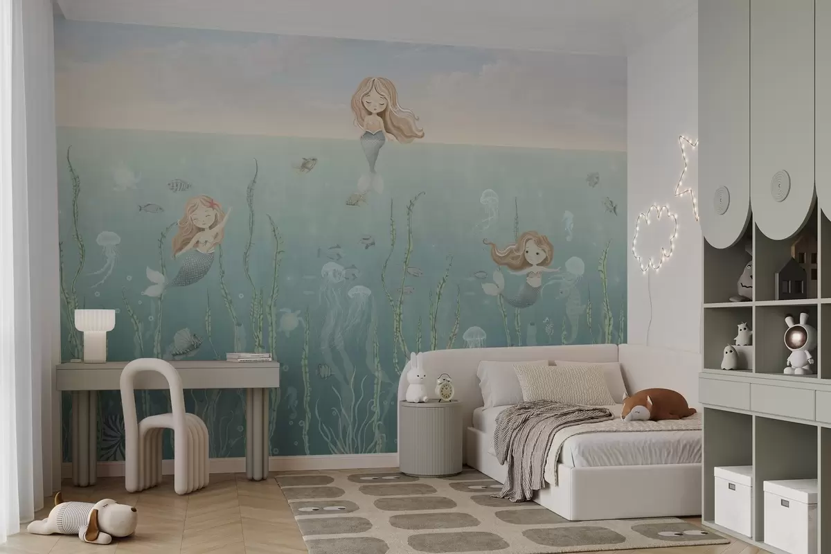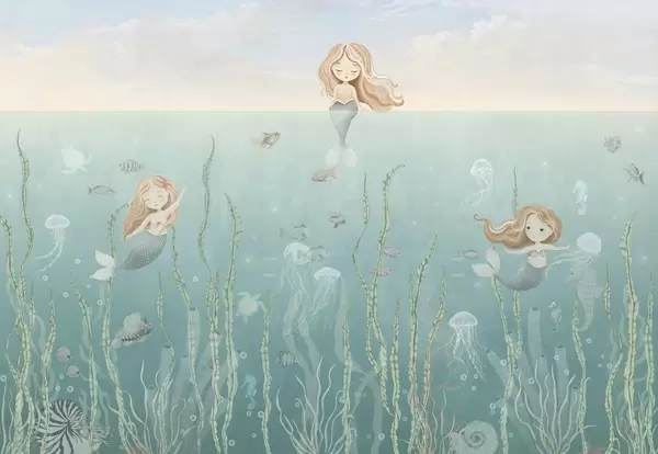 Тапете за зид Разигране сирене под водом са морским алгама, медузама и рибама бр. w04860