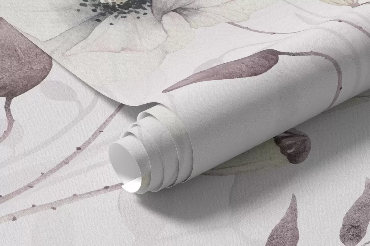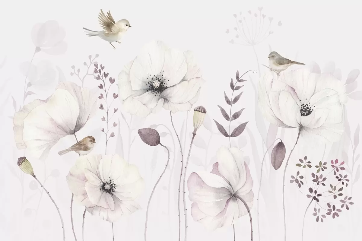 Тапете за зид Акварелни макови са малим птицама у нежно љубичастој боји бр. w04861