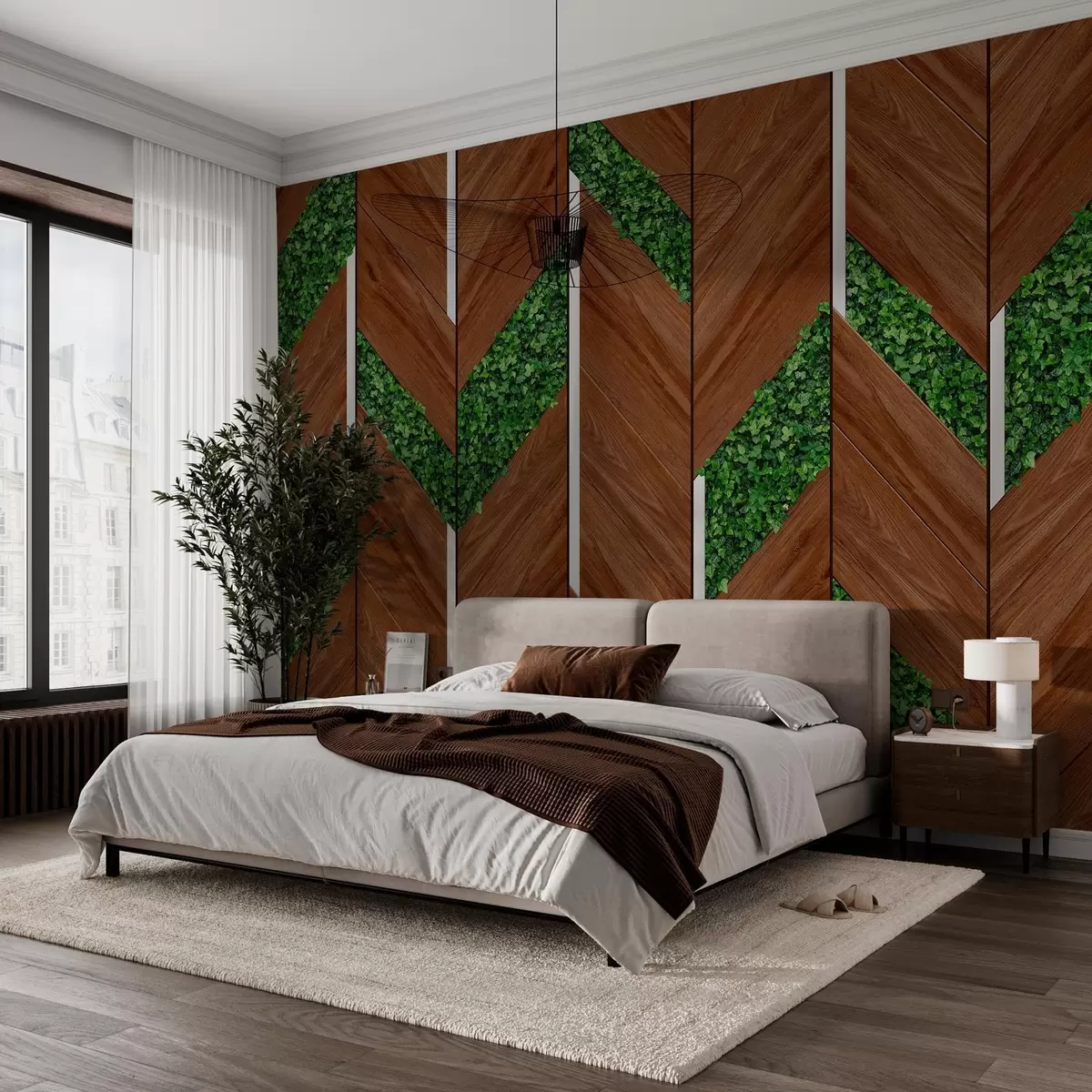 Тапете за зид имитација тамних дрвених панела са биљним уметцима бр. w04875v1