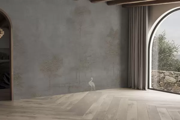 Тапете за зид Магловита шума са чапљом и украсним узорком изнад бр. w04953v1