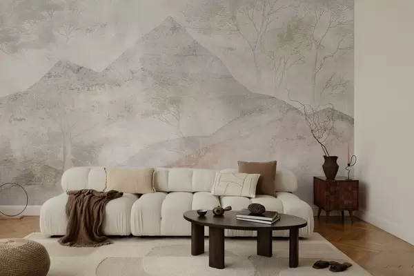 Тапете за зид Меке пастелне планине и дрвеће у лаганој магли бр. w04954