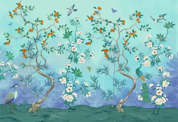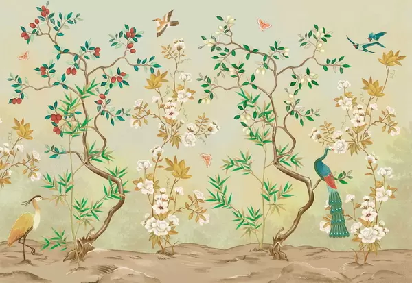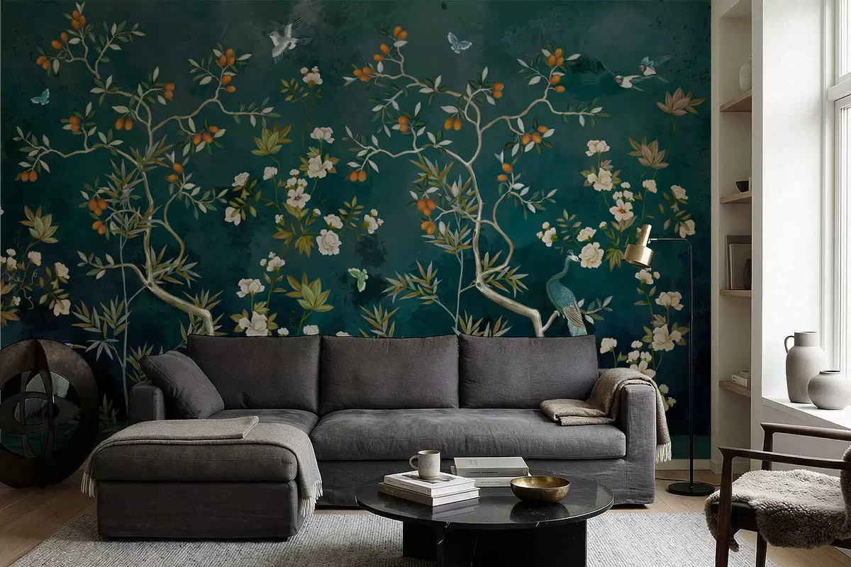 Тапете за зид Декоративна сцена са дрвећем, цвећем и птицама на тамној позадини бр. w05004