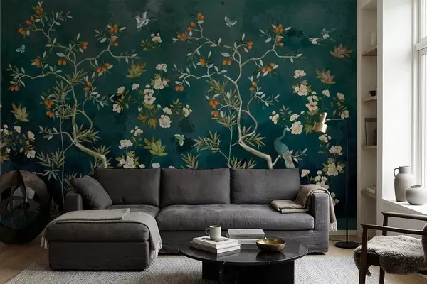 Тапете за зид Декоративна сцена са дрвећем, цвећем и птицама на тамној позадини бр. w05004