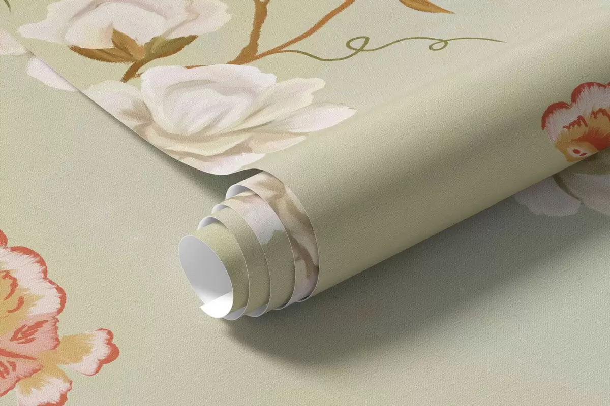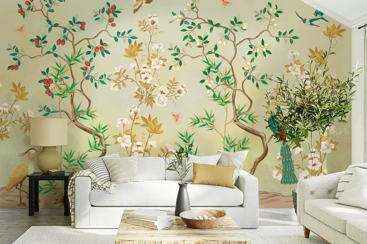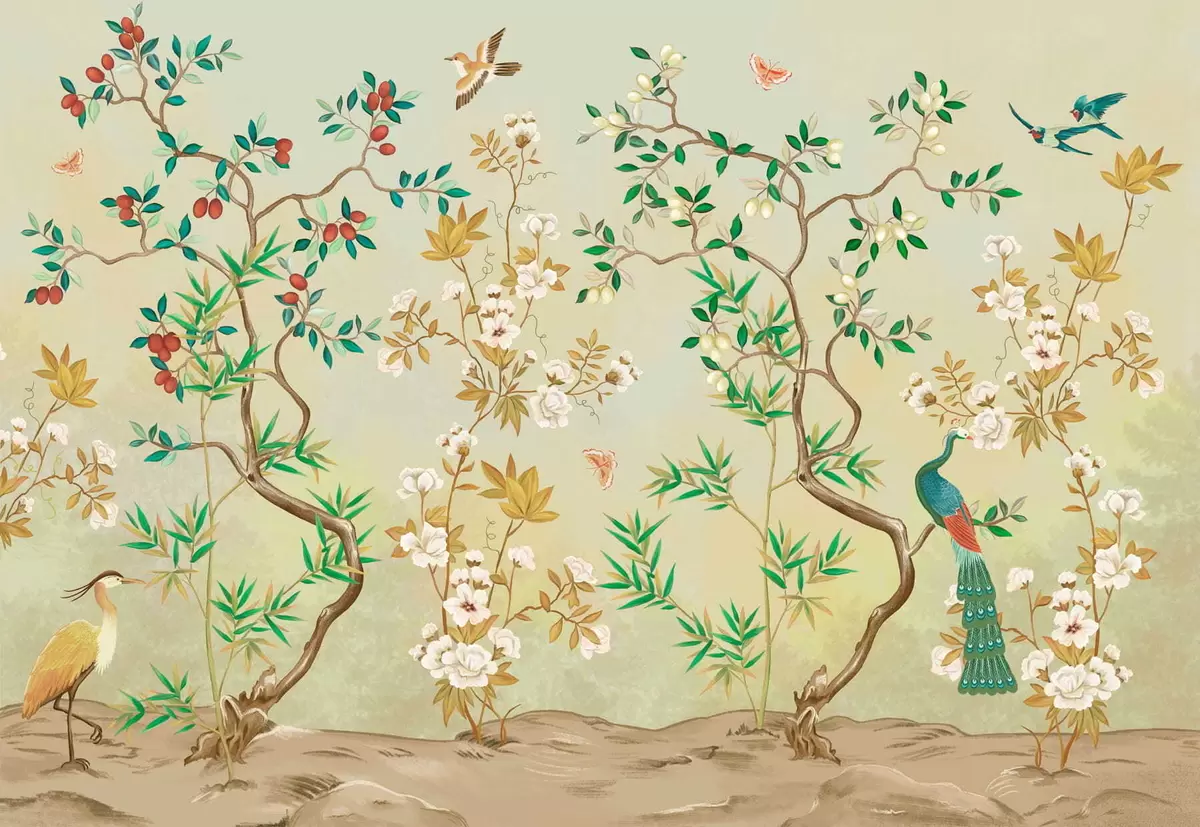 Тапете за зид Сцена са дрвећем, цвећем и птицама, светла позадина бр. w05004v1