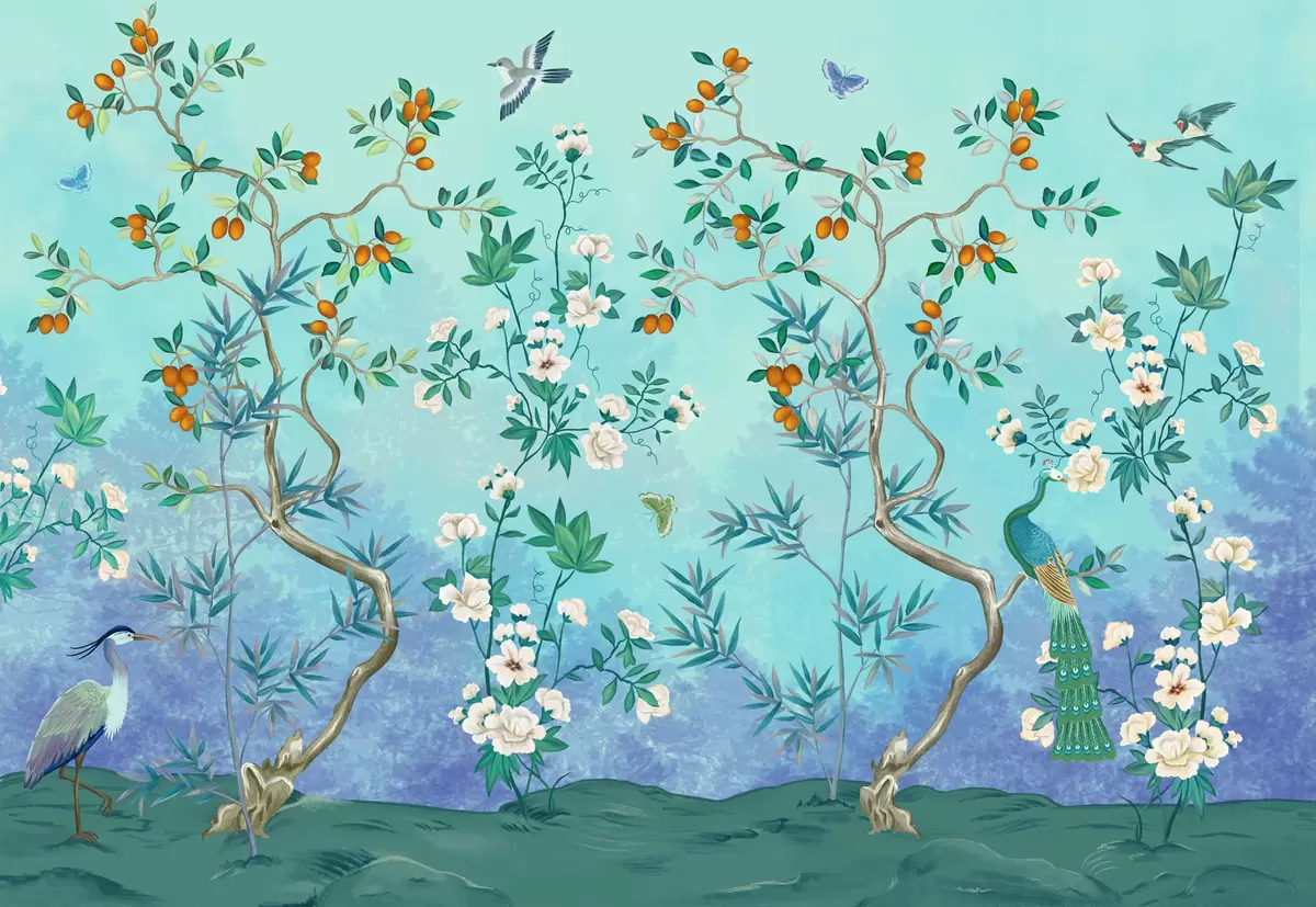 Тапете за зид Сцена са дрвећем, цвећем и птицама, плава позадина бр. w05004v2