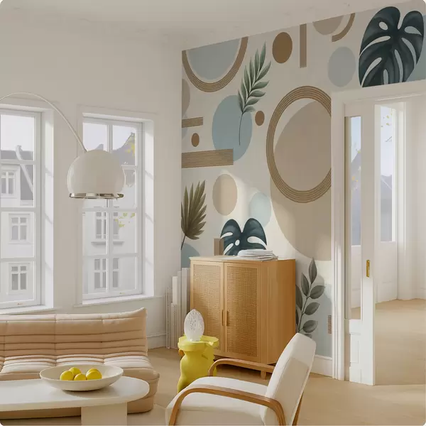 Тапете за зид Геометријски узорак са листовима и круговима у мирним тоновима бр. w05018