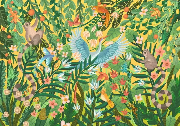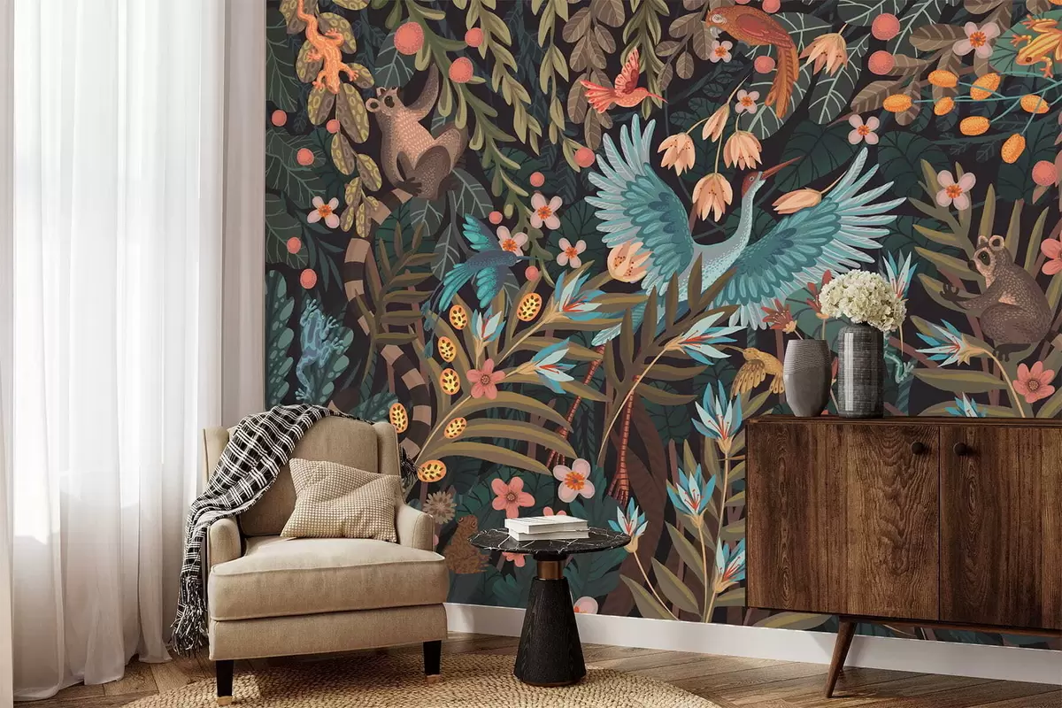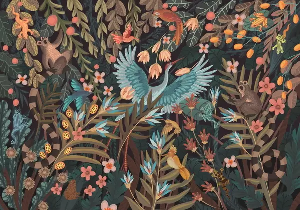 Тапете за зид Фантазијска сцена са птицама и животињама међу биљкама бр. w05024