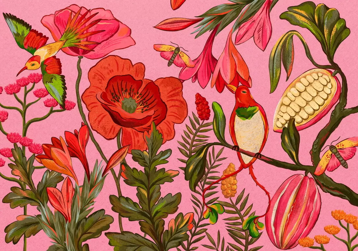 Тапете за зид Декоративно цвеће и птице на ружичастој позадини бр. w05036v2
