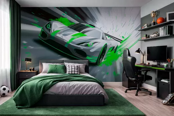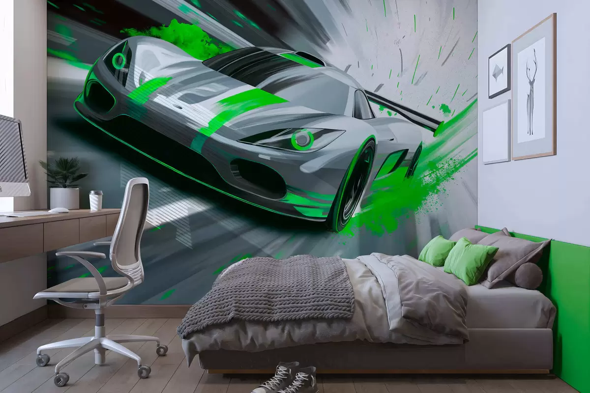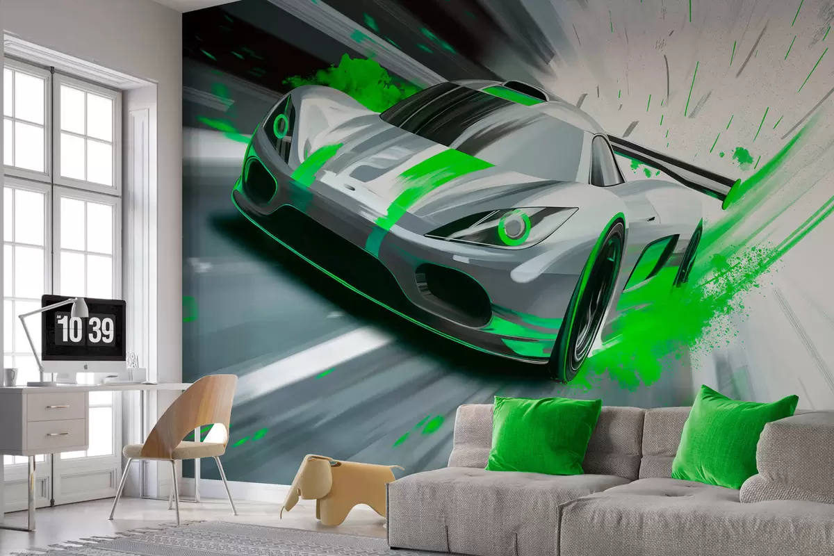 Тапете за зид динамичан спортски аутомобил у дигиталном стилу цртања са зеленим акцентима бр. w05069v4