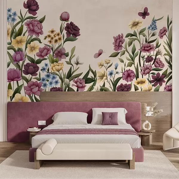 Тапете за зид Цветна композиција са биљкама и лептирима на светлој позадини бр. w05072