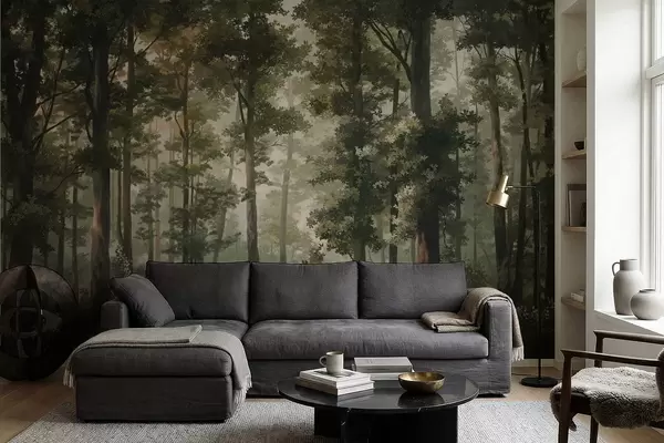 Тапете за зид Илустрација шуме са маглом, високим дрвећем и стазом бр. w05089