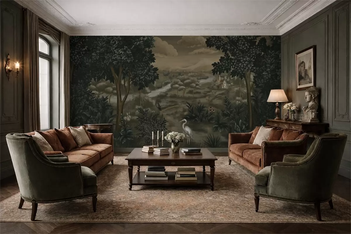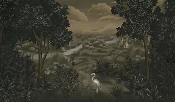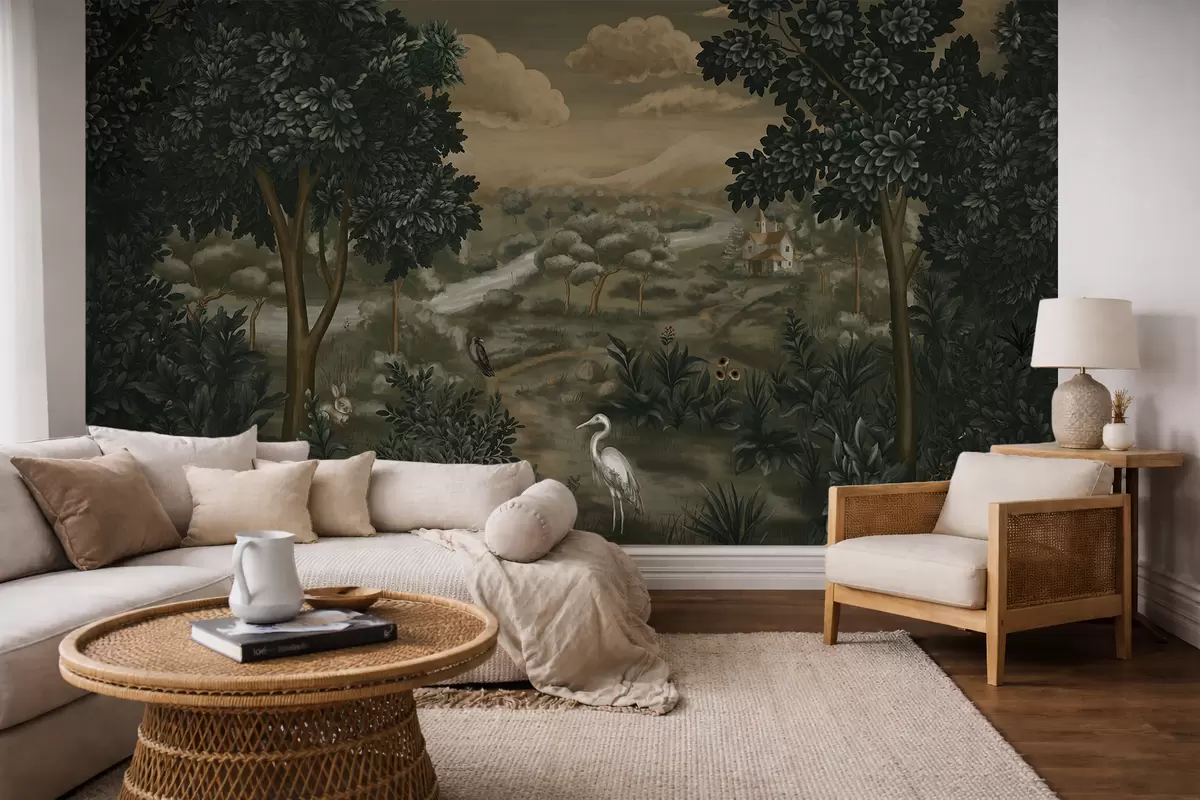Тапете за зид Фантазијски пејзаж са реком, кућом и птицама међу дрвећем бр. w05090