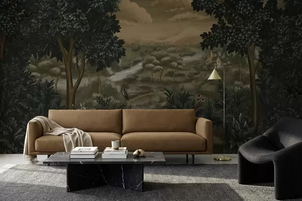 Тапете за зид Фантазијски пејзаж са реком, кућом и птицама међу дрвећем бр. w05090