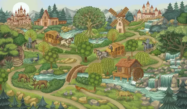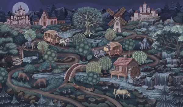 Тапете за зид Ноћна вила са дворцима, млиновима и шумом бр. w05091