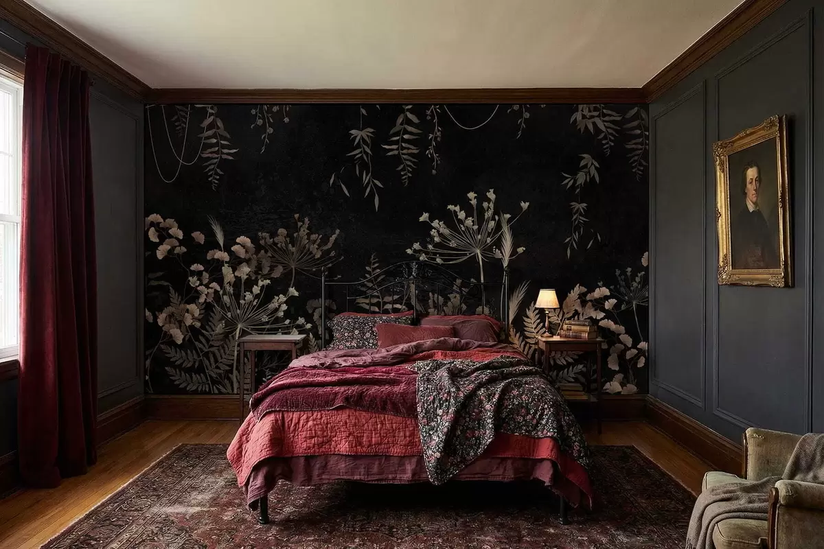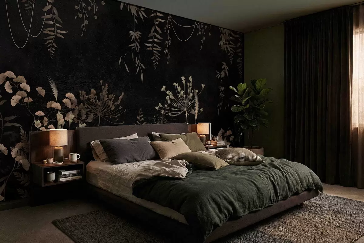 Тапете за зид Тамни ботанички узорак са цвећем и лишћем бр. w05092