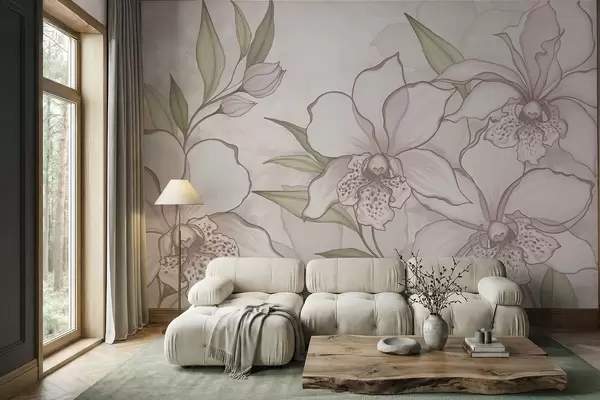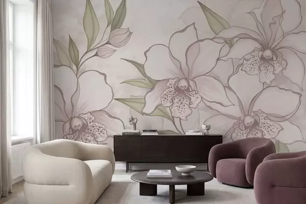 Тапете за зид Илустрација бледих орхидеја са листовима на беж позадини бр. w05117