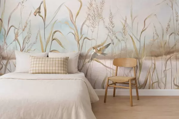 Тапете за зид Илустрација трске и птица поред воде у меким тоновима бр. w05125