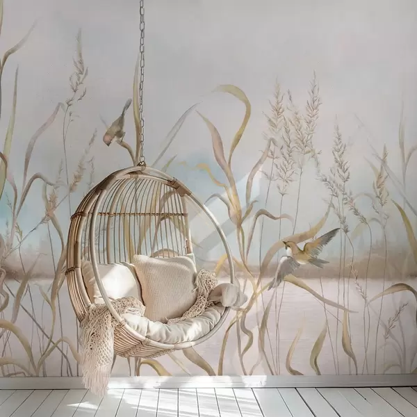Тапете за зид Илустрација трске и птица поред воде у меким тоновима бр. w05125
