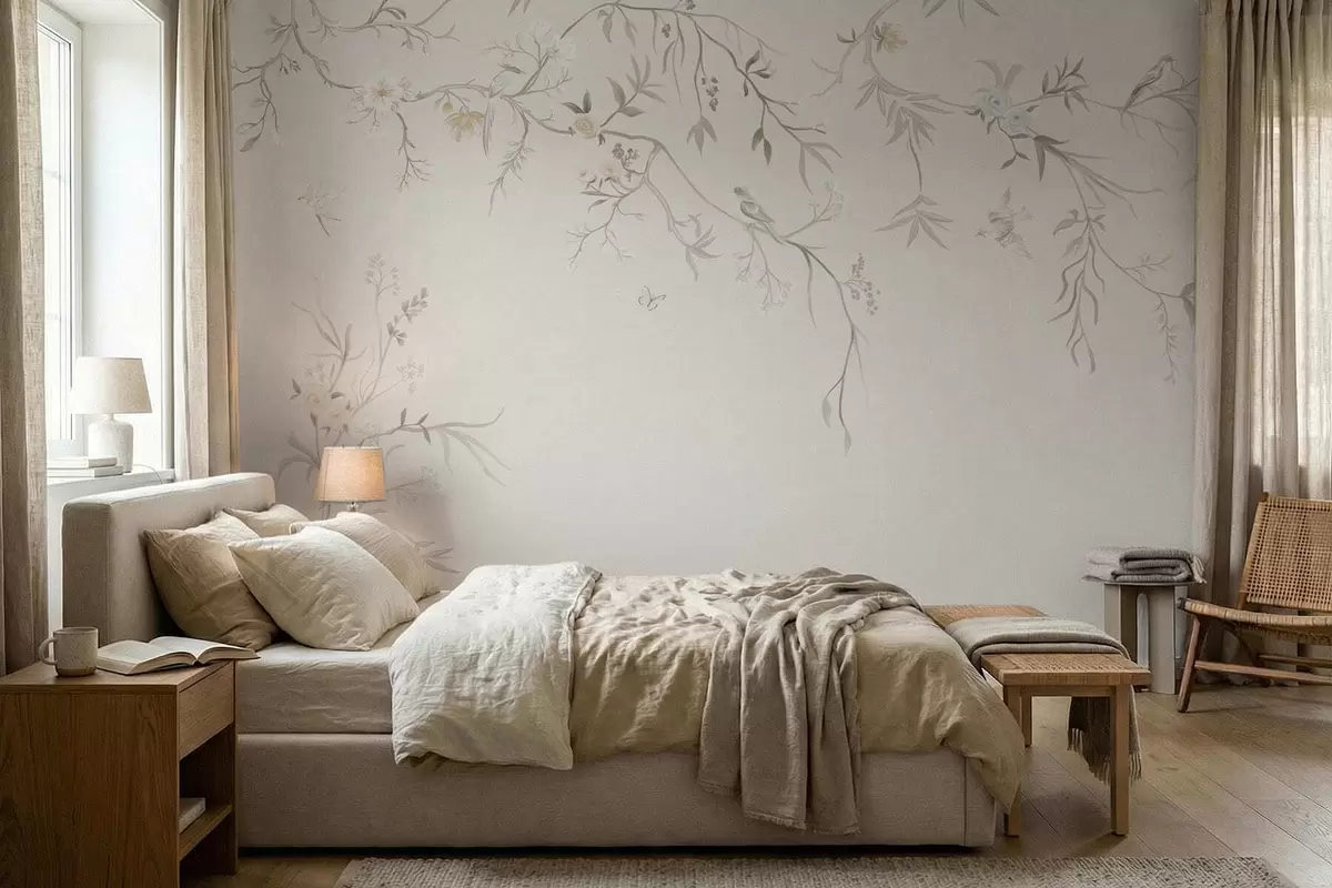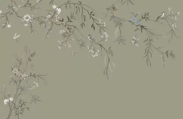 Тапете за зид Нежно цвеће и птице на кредастој позадини бр. w05127