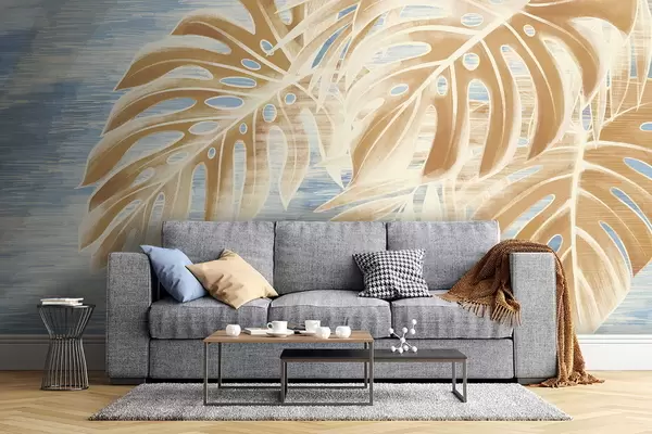 Тапете за зид Листови у светлим пешчаним тоновима на плавој позадини бр. w05130v1