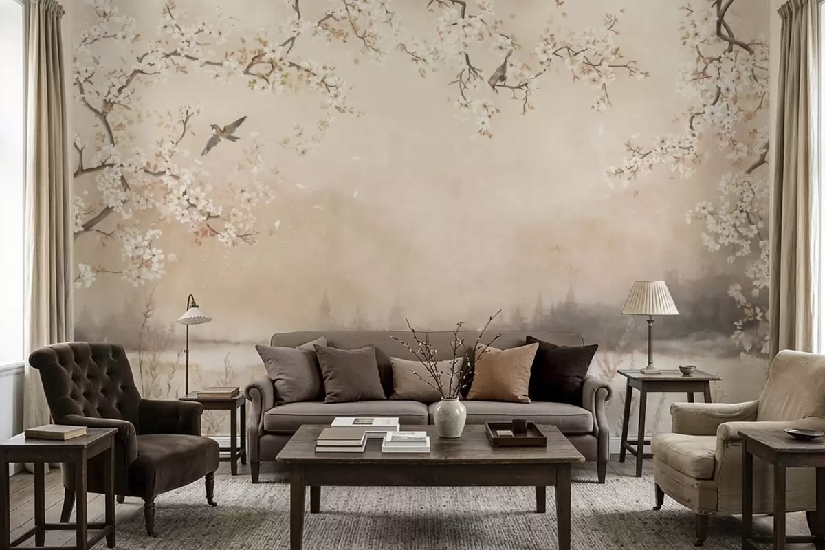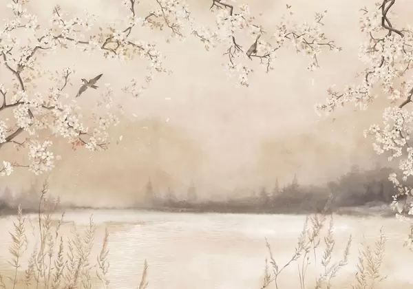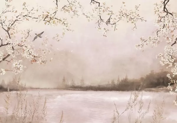 Тапете за зид Нежне цветне гране поред језера са птицама у лаганој магли бр. w05155
