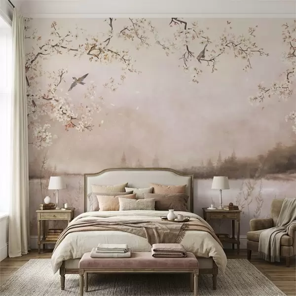 Тапете за зид Цветајуће гране изнад мирног језера са птицама у магли бр. w05155v1